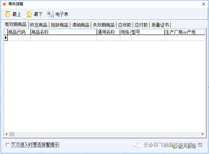 事务提醒:商品有效期提醒、过有效期商品提醒、质量证书快过期预先提醒、积压商品提醒、短缺商品提醒等,可以通过提醒功能及时处理和更换。